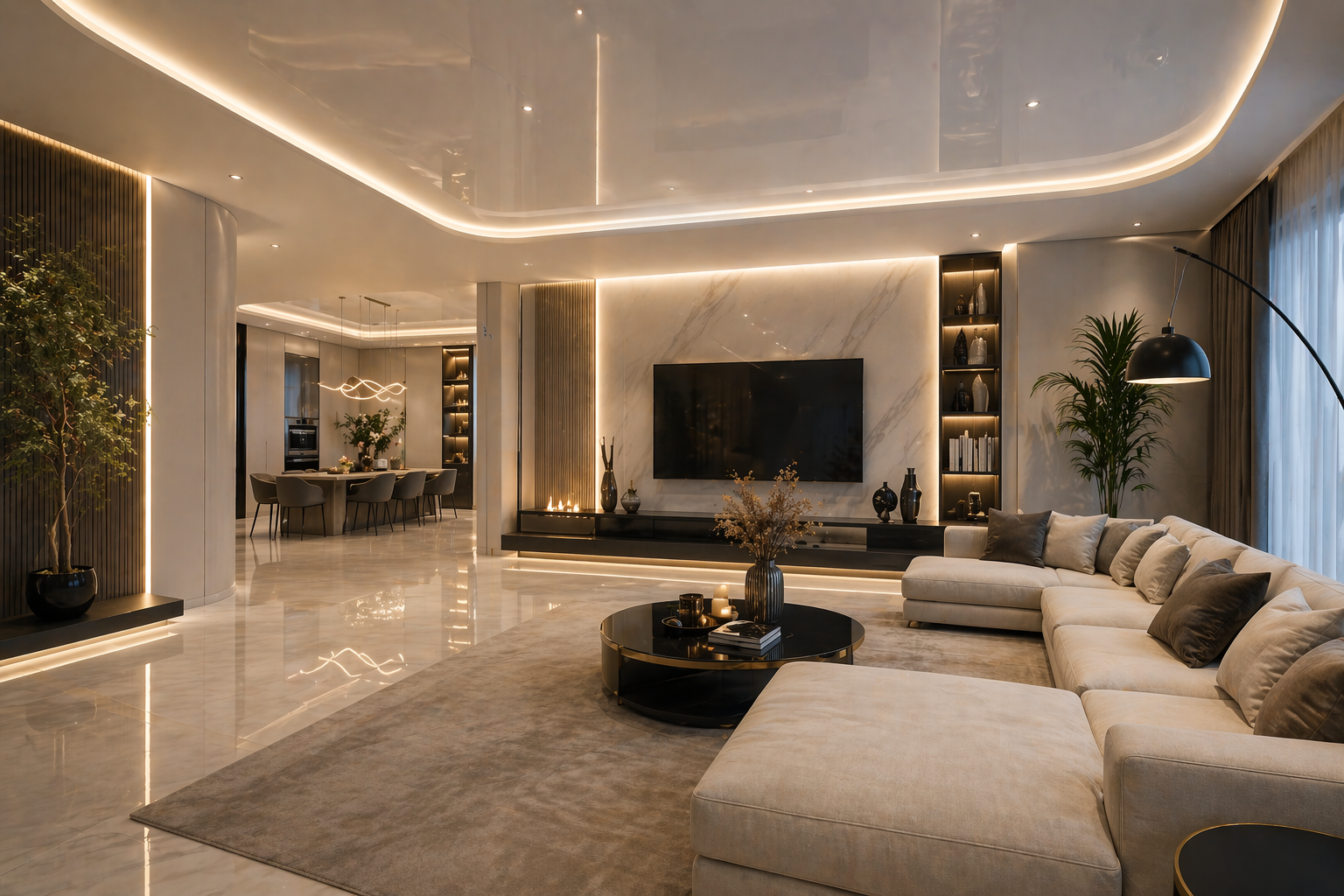Spektakuläre Deckenarchitektur mit mehreren Folienebenen, geometrischen Formen und integrierten Lichtvouten. Für Räume, die bleibenden Eindruck hinterlassen.